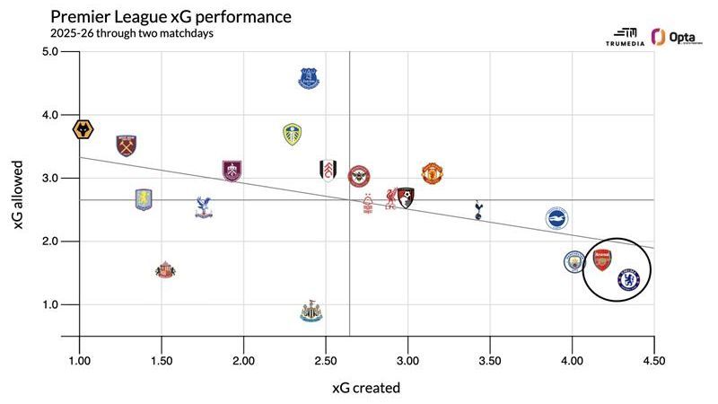 Arsenal and Chelsea have combined to allow just one shot attempt worth more than 0.2 xG in 360 minutes. Meanwhile, Arsenal have attempted five such shots (tied for second most in the league) and Chelsea have attempted nine, nearly twice as many as anyone else. Entering the season, I was concerned about Chelsea constantly shuffling their attacking personnel, and they could still make some more transfer moves both in and out before next week's transfer deadline.