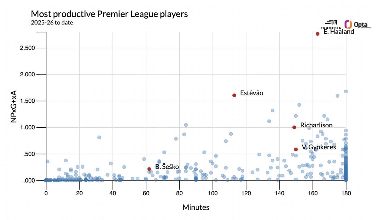 Meanwhile, in just 113 minutes of action, 18-year-old Estevao, acquired by Chelsea from Palmeiras for a relatively modest €34 million, has been one of the most active players in the Premier League. He tries stuff. He has more progressive carries (10) and one-on-one attempts (nine) than Richarlison, Gyokeres and Sesko combined (nine and eight, respectively). Starting for Cole Palmer on short notice Friday, he assisted Enzo Fernández's 33rd-minute goal to put Chelsea up 3-1, and his combined NPxG+xA (see below) is among the best in the league. Again: He has played only 113 minutes!