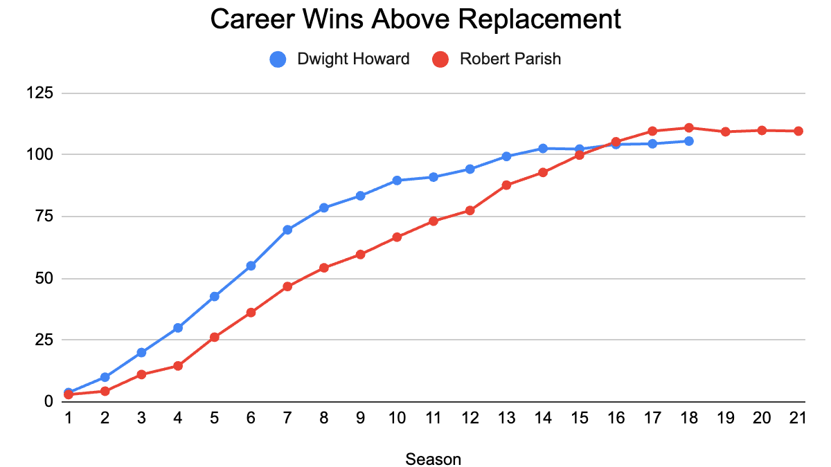 The differences in peak value meant Howard made eight career All-NBA teams, and Parish made just two (one second, one third). However, Parish continued to produce throughout his 30s and won three titles with the 1980s Celtics (plus a fourth as an end-of-bench player for the 1996-97 Chicago Bulls), so he made the 75th Anniversary Team while Howard missed out.