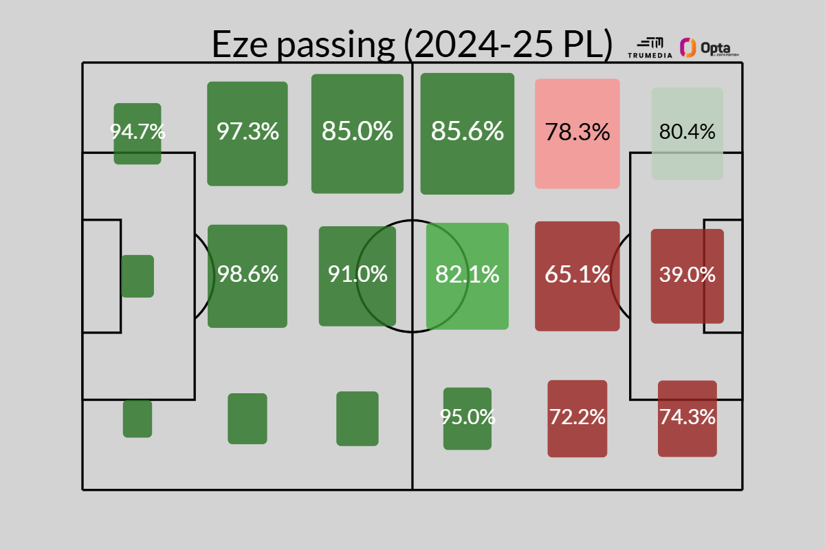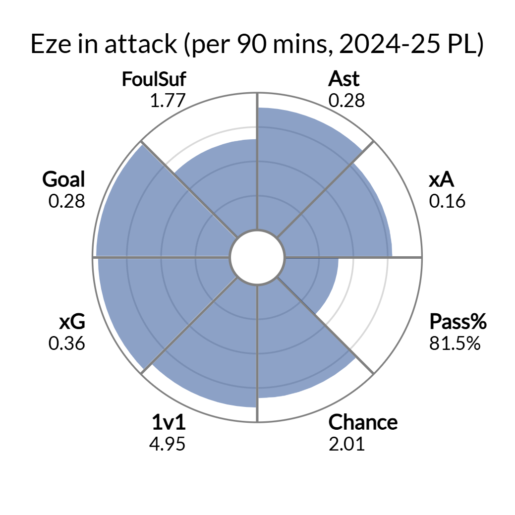A decade after making his professional debut as a 16-year-old, Eze has developed into a fine all-round attacking midfielder. He ranked in the 90th percentile among Premier League footballers last season for successful take-ons and the 89th percentile for shot-creating actions. Gradient Sports gave him a tackling resistance grade of 81.2, the third best of anyone in his position.