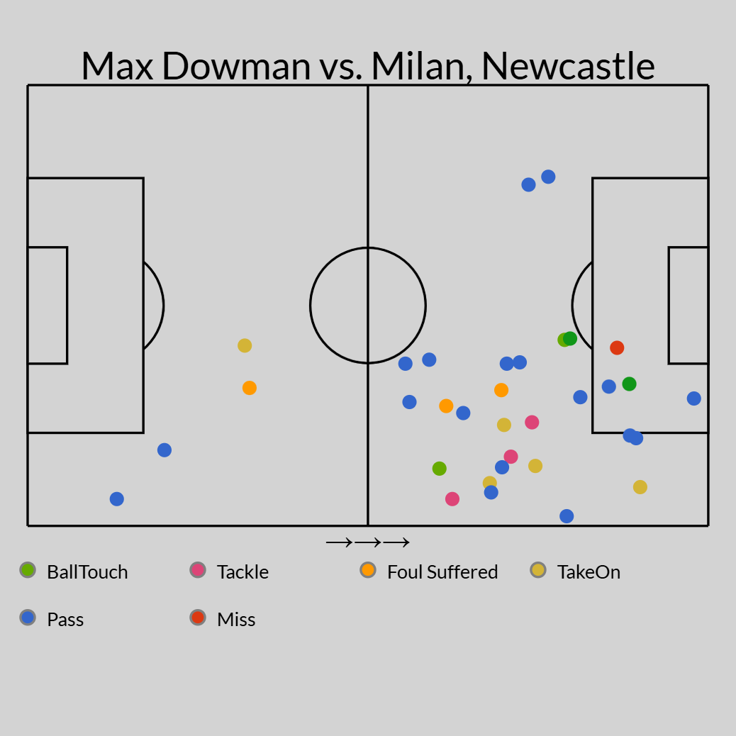 Technically, Dowman's range of passing is excellent and his efforts in the final third are incisive and weighted, whether feeding advancing fullbacks, playing one-twos around the box or attempting disguised through balls. He can also finish effectively with either foot, rarely needing extra time to shift the ball onto his left (which also gives him an advantage when dribbling).